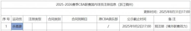 CBA官网更新国内球员注册信息 浙江为余嘉豪进行了预注册 直播吧8月31日讯 CBA官网今天更新了国内球员注册信息,其中,浙江男篮为余嘉豪进行了预注册。余嘉豪新赛季将去西班牙联赛闯荡。不过预注册... 德甲 2026.01.16 0 19